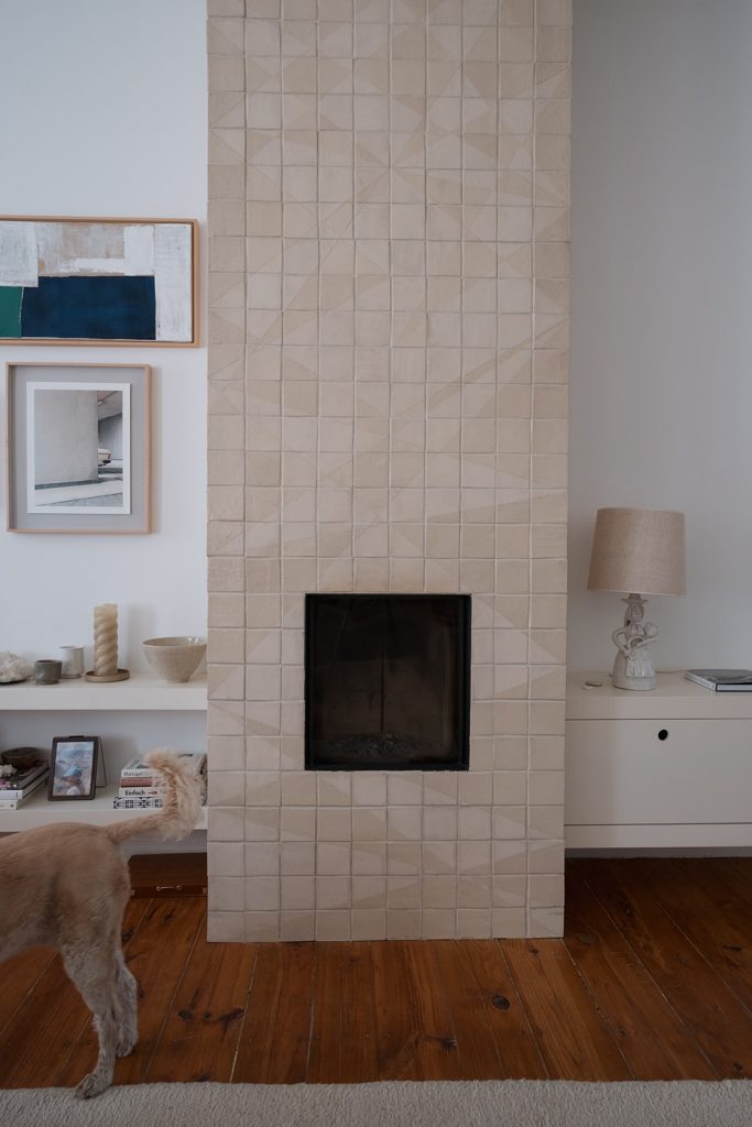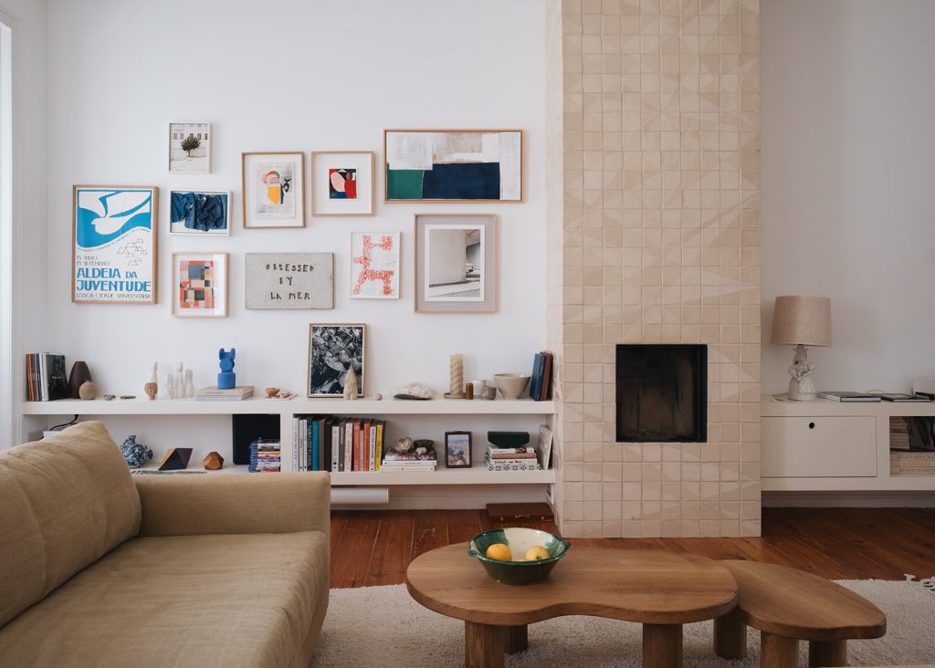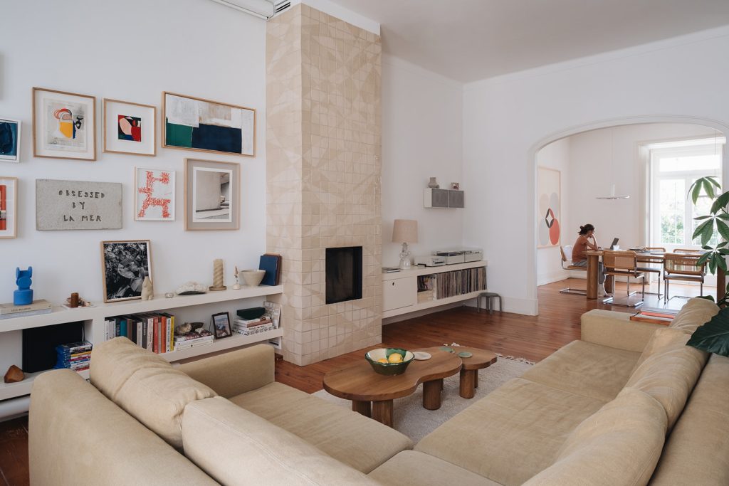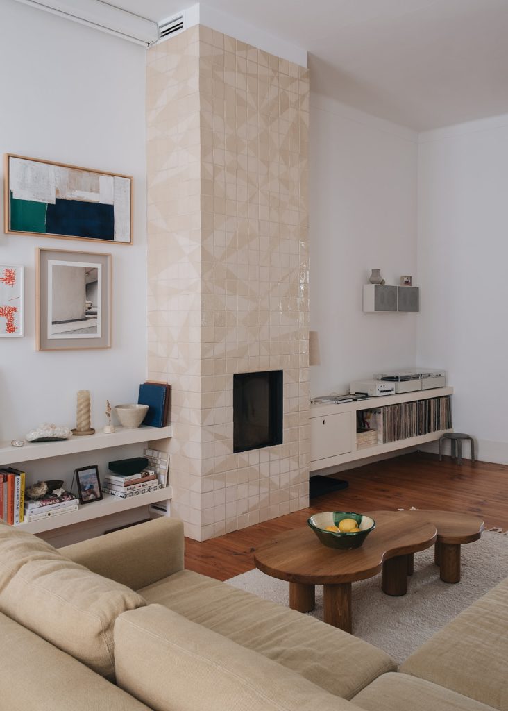 Los propietarios de esta casa, alemanes afincados en Lisboa, decidieron incorporar una chimenea a su casa durante el proceso de rehabilitación. En su país es costumbre recubrir las chimeneas con cerámica, de forma que el calor se mantenga por más tiempo en el espacio. Querían un elemento sobrio, que no alterara la estética de la casa, y que conviviera en armonía con las obras de arte presentes en el salón y en el comedor al que este se abre.