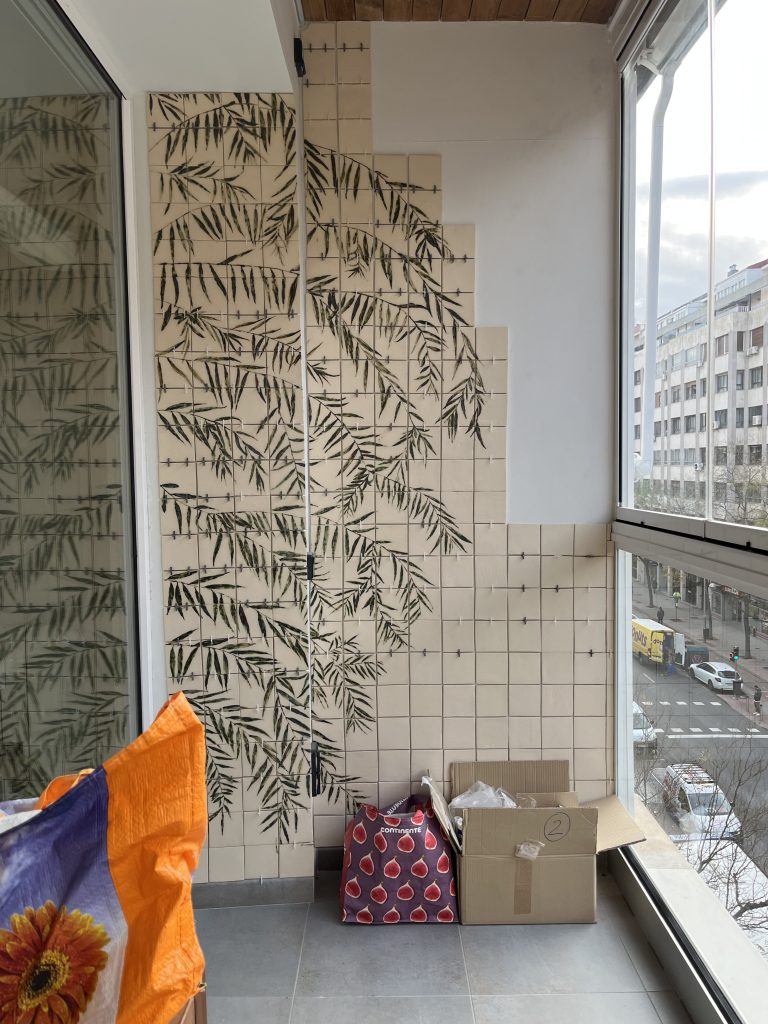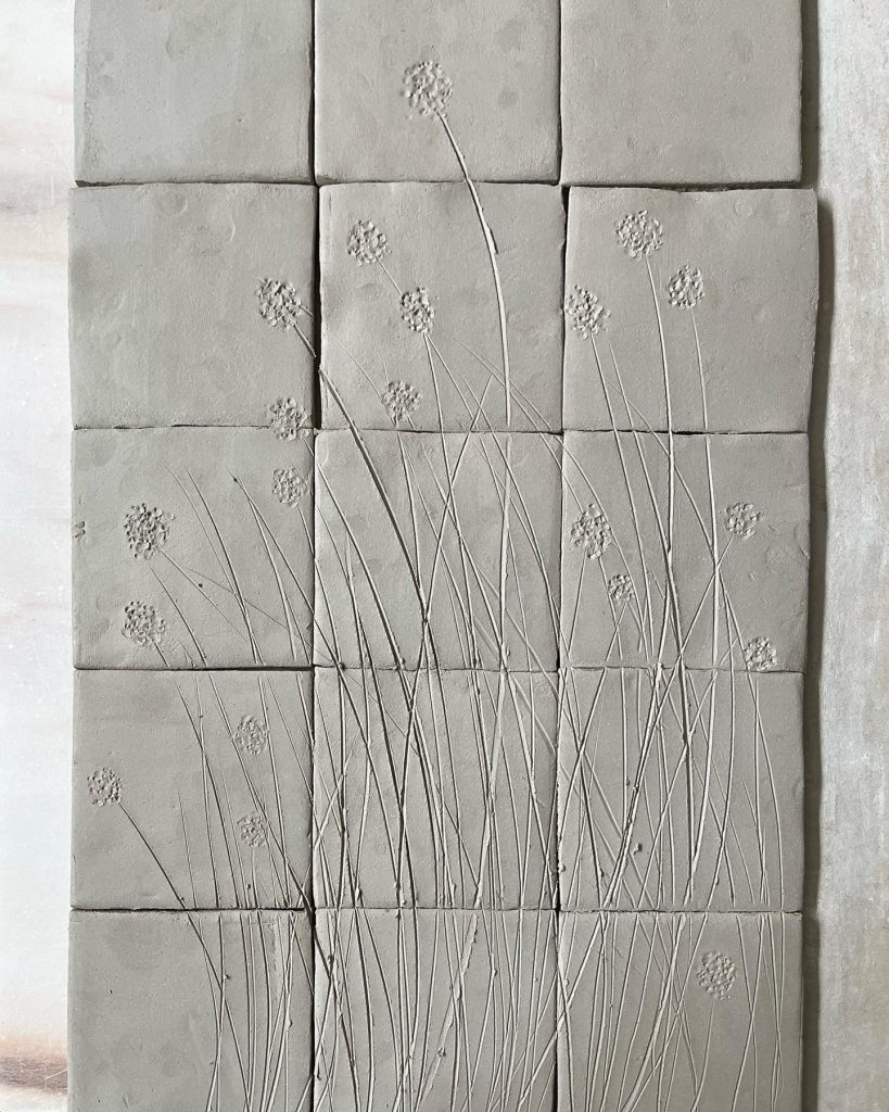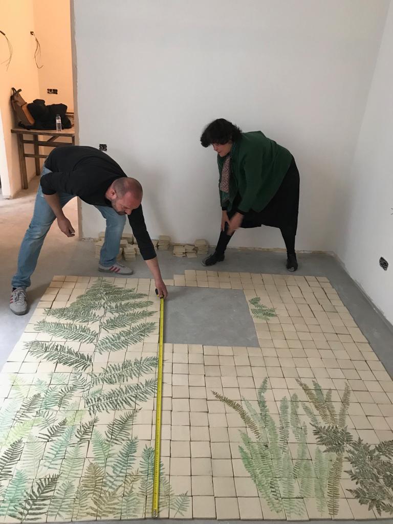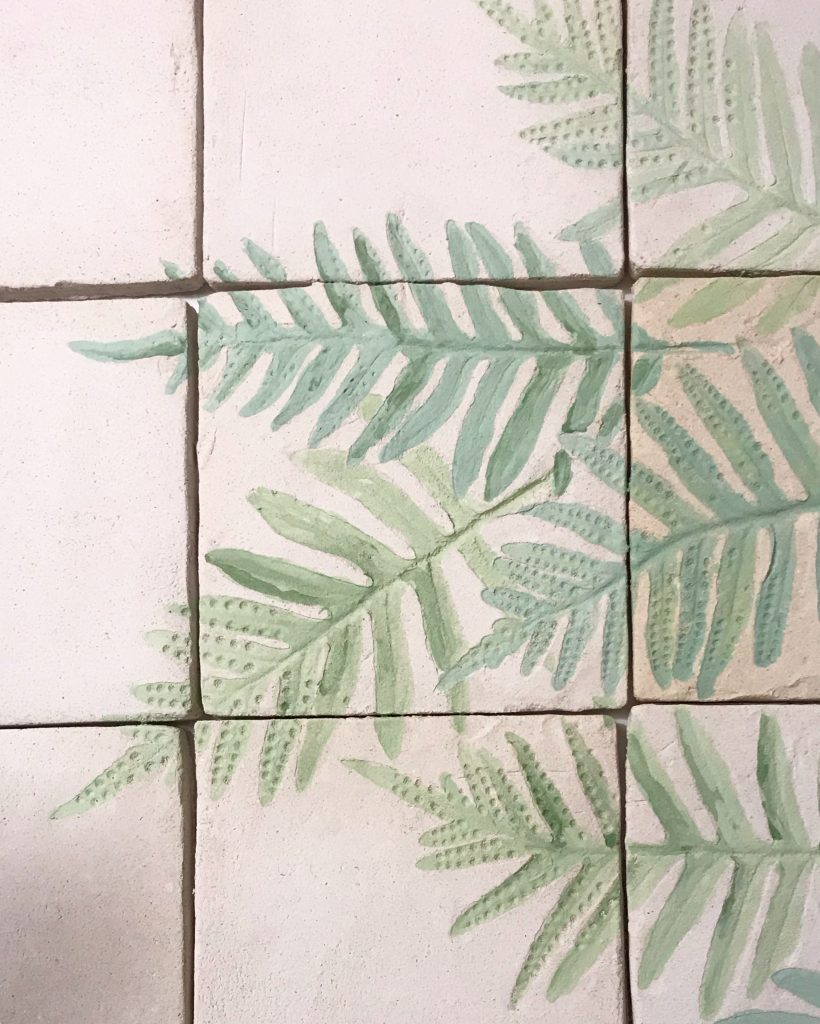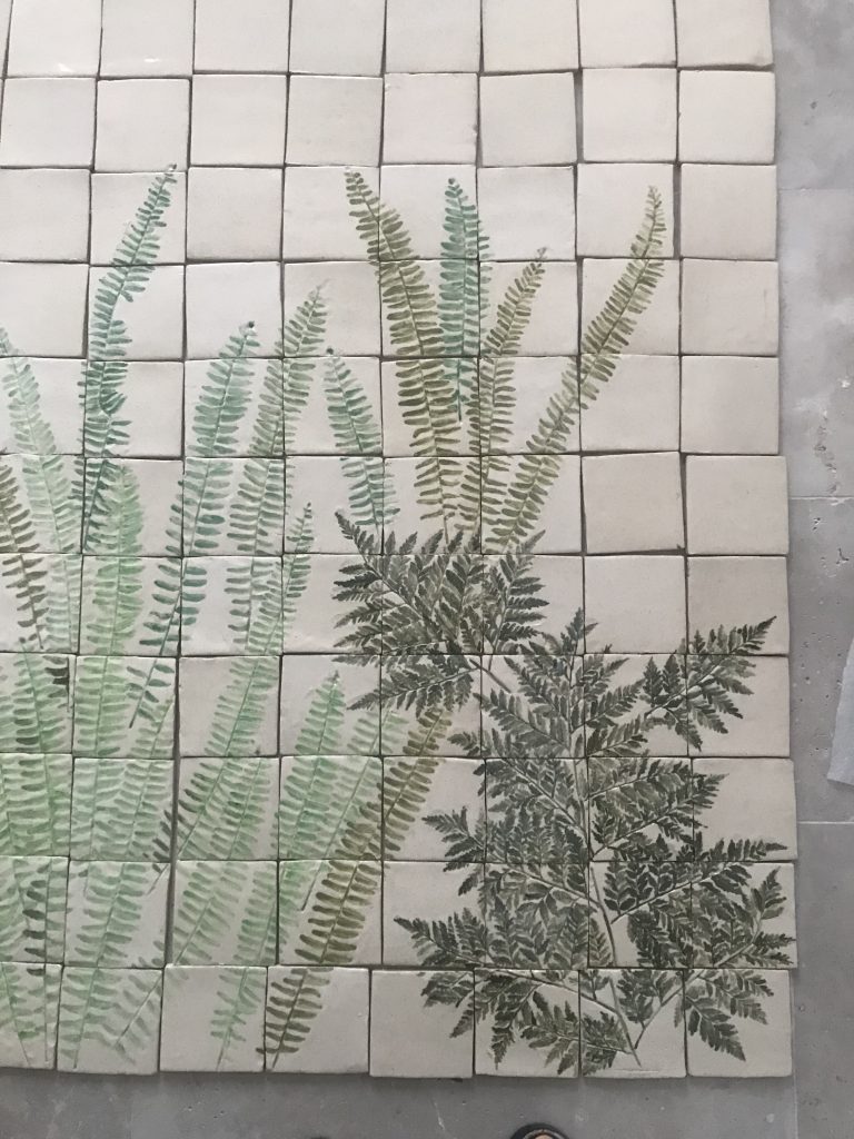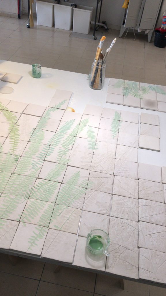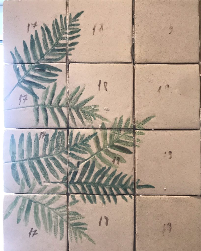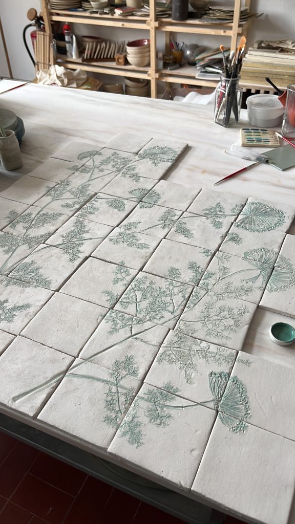 Utilicé plantas recogidas de las huertas y patios cercanos que había identificado durante años en el semi-abandonado jardín al que se asomaba la casa. Imprimí las hojas sobre los azulejos de grés cuando estaban todavía blandos, y, tras una primera cocción, los teñí con óxido de cromo que posteriormente esmaltaría antes de cocer definitivamente.