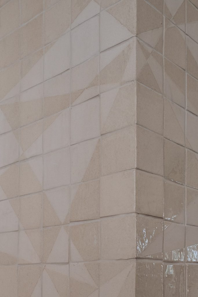 Propuse un panel sin color, en el que el dibujo geométrico nace de la yuxtaposición de zonas esmaltadas y zonas en las que el azulejo no lleva esmalte. Todas las piezas están cocidas a una temperatura muy alta (1300ºC) para conseguir así que en las zonas no esmaltadas el poro del grés se cierre e impida la entrada de suciedad.